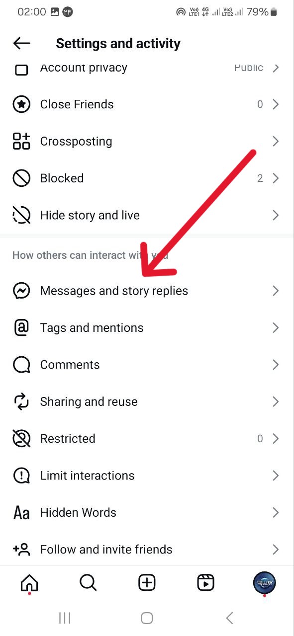- Now, in the Settings menu, scroll down and select the “Messages and story replies” option.