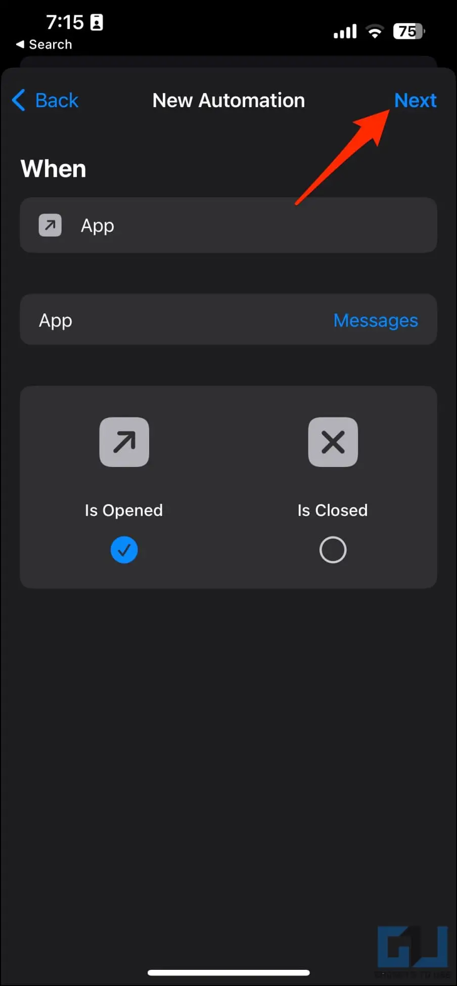- Make sure the Is Opened and Run Immediately options are checked. Then tap Next in the top right corner.