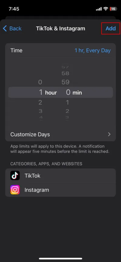 - You can now set the time limit for the app you selected. To lock apps on your iPhone, set the time limit to one minute.